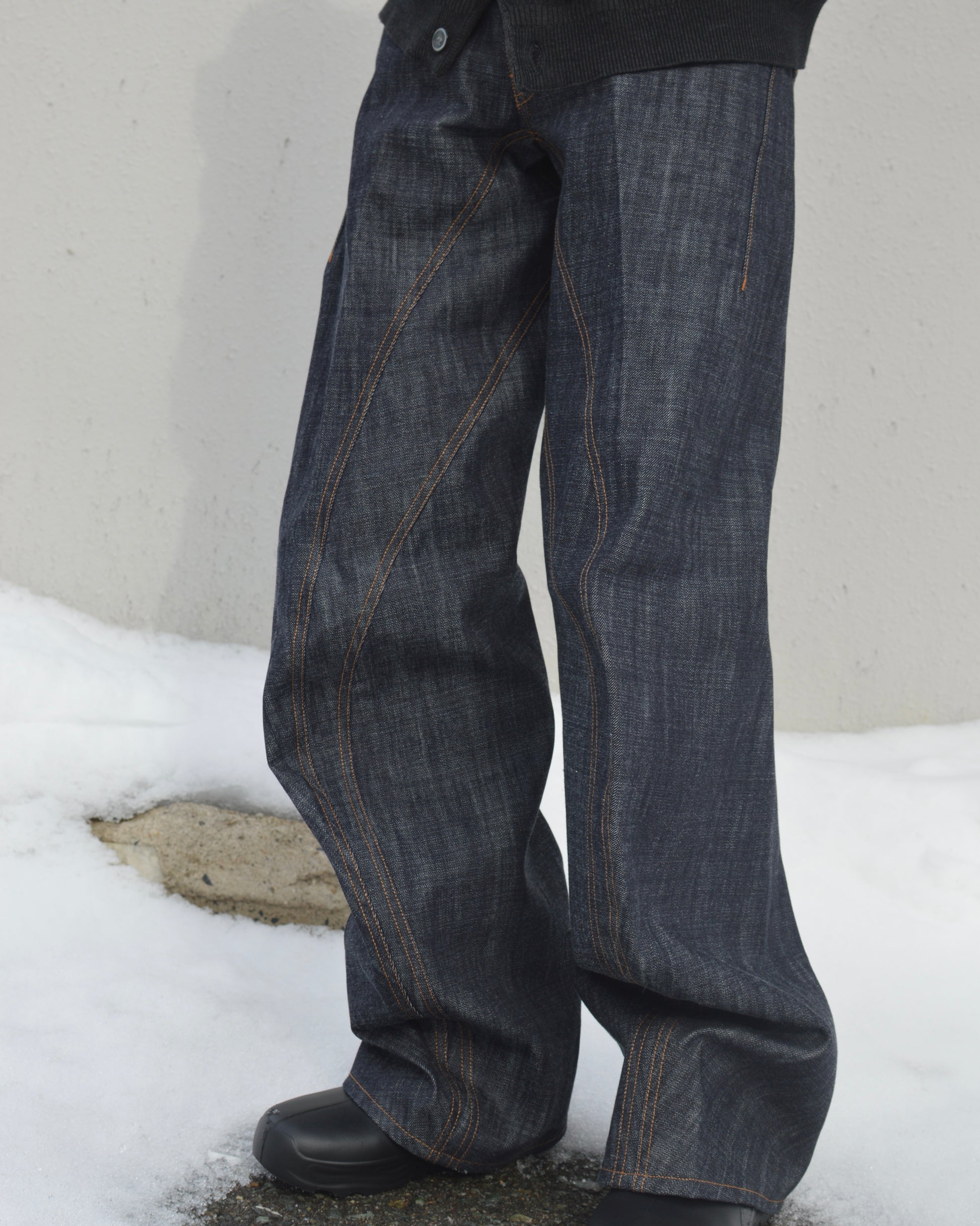 13ozナチュラルスラブ ローテンション織りデニムを使用。シグネチャーモデルから再構築し3Dパターンメイキングを駆使した立体裁断により、内股から外側へかけて湾曲したカーヴシルエットを形成。脇線を排除し膝の湾曲を更に強調したローライズシルエット。ウエストとヒップ差寸を少なくした腰履きに適したフィッティング。タック釦とリベットはレーザー彫刻によるオリジナルパターン入り。