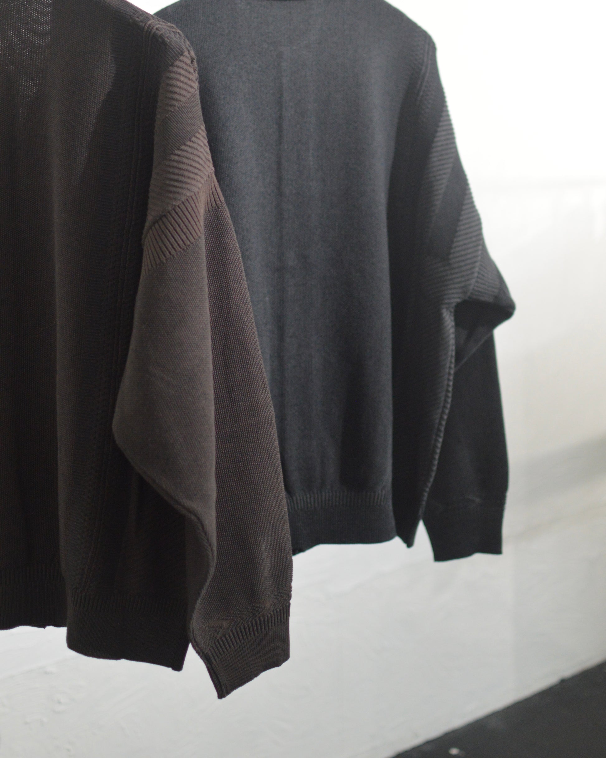 プレーティング編みと言われる表目側と裏目側で異なる糸を編む技法を使用し、表と裏で糸の色を変えて、2色で編むことで奥行きのある表情に仕上げました。
